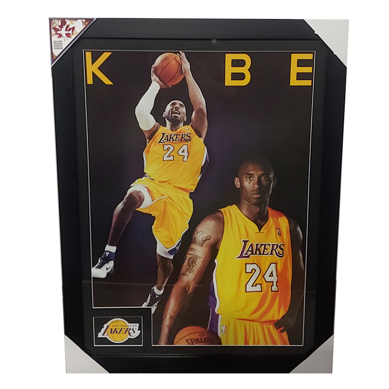 An open edition poster print featuring two action shots of the late LA Lakesr legend Kobe Bryant. The teams logo is in the bottom left corner. Framed wit ha black top mat and 2″ flat black moulding.