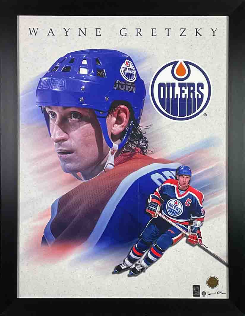 About the print: An open edition giclee print officially licensed by the NHL and NHL Alumni featuring four-time Stanley Cup Champion Wayne Gretzky. NHLPA gold plated coin and Alumni and NHL holograms on the bottom right side of the print.
