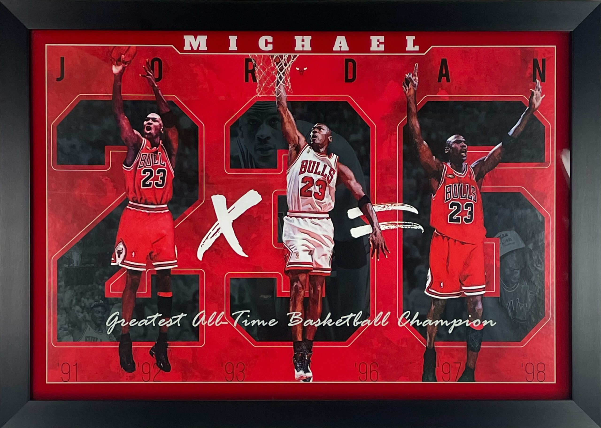 Open edition print and fully licensed through the NBA. The print features 3 photos of Jordan with his #’s in the background. Listed at the bottom of the print are the years that he won the championships which are ’91, ’92, ’93, ’96, ’97, ’98. The print is framed with a black top mat and 2” flat black moulding.