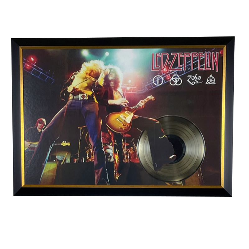 A live concert image of the band Led Zeppelin at The Forum, Inglewood, CA on March 27th 1975. The bands name along with their iconic “ZOSO” symbols is in the top right corner. Band member Jimmy Page decided that the Led Zeppelin IV album would not have a title but would instead feature four hand-drawn symbols on the inner sleeve and record label, each one chosen by the band member it represents. You can learn more about the symbols here. A gold record sits in the bottom right corner. It is framed in a 2 1./4” black moulding with a gold lip.