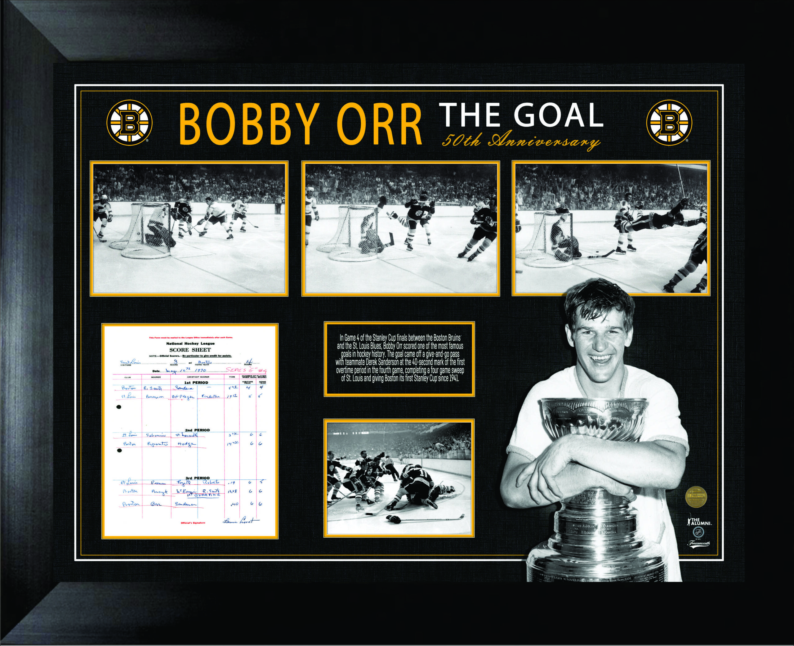 n 1970 Bobby Orr went on to lead the Bruins in a march through the playoffs that culminated on May 10, 1970, when he scored one of the most famous goals in hockey history and one that gave Boston its first Stanley Cup since 1941.The goal came off a give-and-go pass with teammate Derek Sanderson at the 40-second mark of the first overtime period in the fourth game, helping to complete a sweep of the St. Louis Blues. This commemorative 50th Anniversary frame features; an NHL alumni gold coin, famous shots of Bobby Orr mid-air celebrating his “Flying Goal”, a photo of him with the Stanley Cup, and an 8×10″ NHL replica score sheet that displays the exact markings on the score sheet from the night of the goal, contained in a 2″ flat black frame.