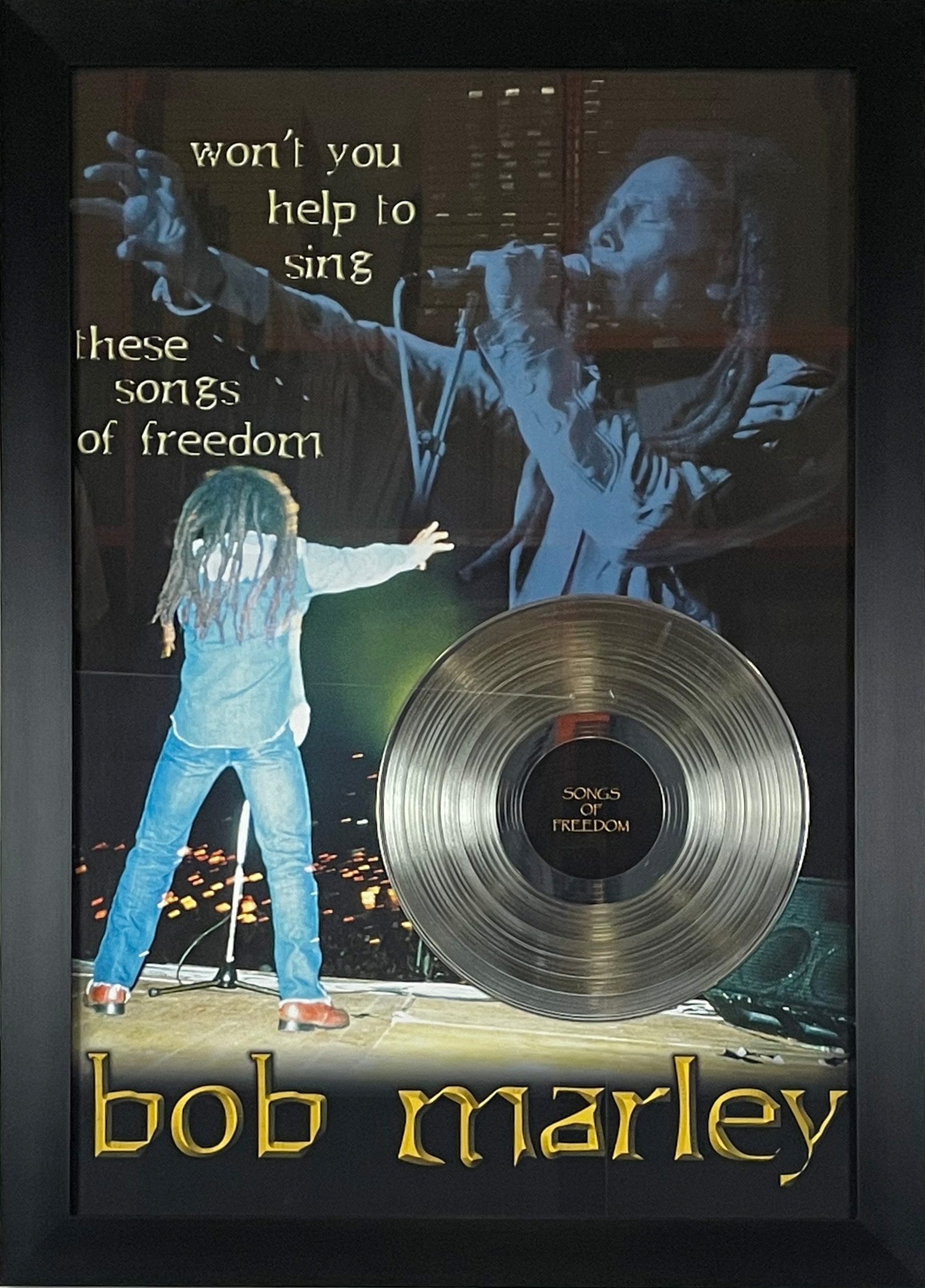 Open edition giclee poster print originally painted by Ohio born artist Stephen Fishwick. This recreation of Pink Floyds album cover ‘Dark Side of the Moon’ is framed with a white top mat matting, a metalized platinum LP and flat black moulding with a silver lip,