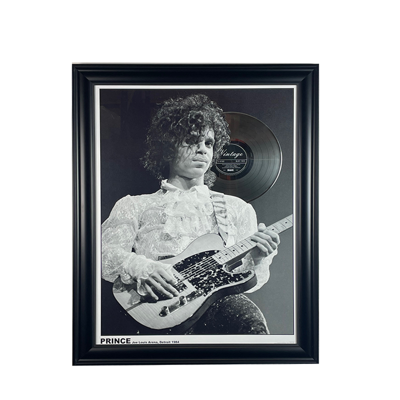 An open edition poster print featuring a black and white iamge of Prince performing live at the Joe Louis arena in 1984. A metalized platinum LP sits behind his head and it is framed in a 2 1/4″ black ridged moulding.
