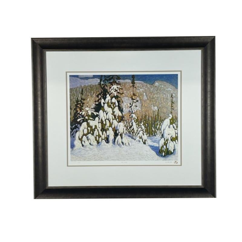 A limited edition reproduction giclee print depicting a snowy forest. The painting was originally created ca. 1915 by Group of Seven artist Lawren Harris and captures the beauty of the Canadian winter landscape. Double matted with a white top mat and black trim, framed in a 2 1/4″ black ridged moulding. Multiple editions may be printed.